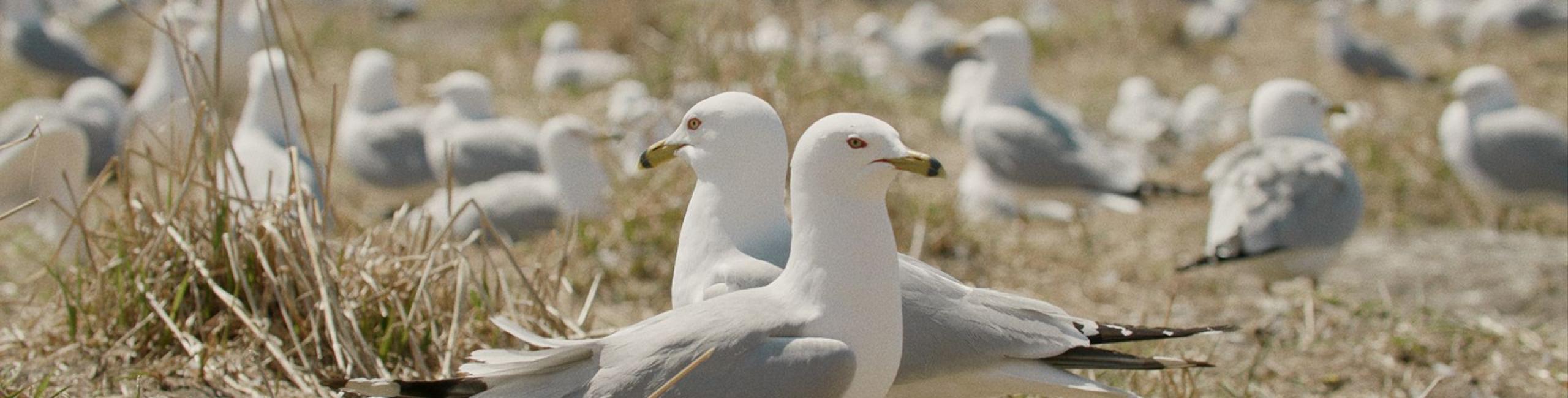 Le cycle de la vie suit son cours dans une colonie de goélands à bec cerclé : on se nourrit, on raille, on cohabite, on se reproduit et protège sa progéniture. Le spectacle de la vie animale ici est captivant, sublimé par le cinéma d’observation sensoriel de Serge-Olivier Rondeau et par un remarquable travail sonore, d’une immersion rare. Mais la routine des goélands est régulièrement perturbée par une ingérence extérieure : certains individus sont capturés, puis relâchés, affublés d’une encombrante balise GPS à la patte, tandis qu’un gigantesque festin empoisonné les appâte, jusqu’à ce qu’un prédateur soit lâché à leurs trousses pour les disperser. C’est que les goélands ont pris l’habitude de fréquenter le plus grand dépotoir du Canada. (MB)